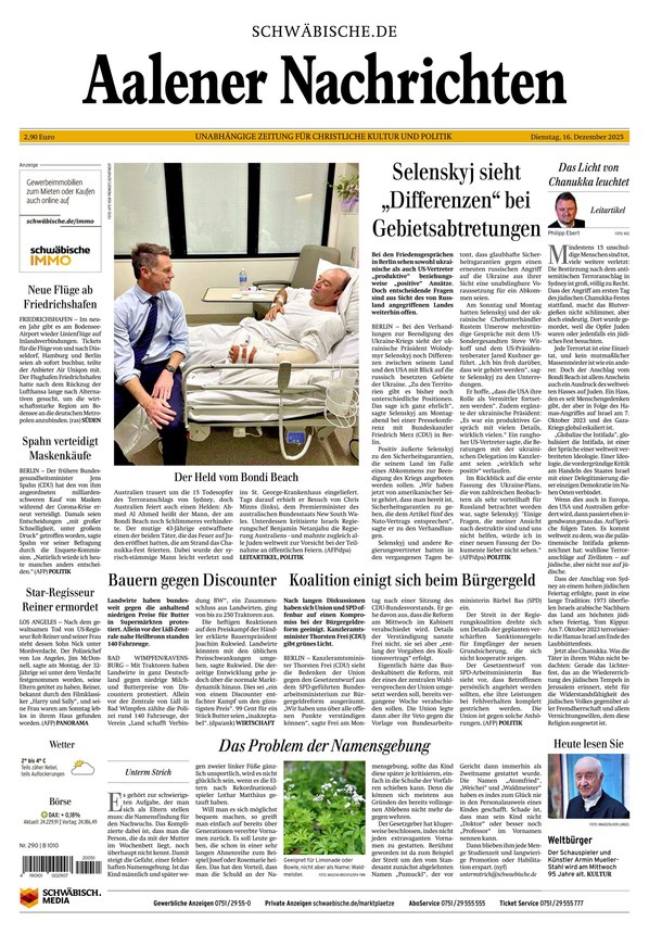 Als Lokalausgabe der Schwäbischen Zeitung erscheinen die Aalener Nachrichten von Montag bis Samstag mit einem überregionalen Teil, der in Ravensburg produziert wird, und die Lokalnachrichten optimal ergänzt. Das ePaper enthält aktuelle Ortsnachrichten und Polizeimeldungen aus Aalen und der gesamten Umgebung. In Dewangen, Ebnat, Fachsenfeld, Hofen, Unterkochen, Unterrombach/ Hofherrnweiler, Waldhausen oder Wasseralfingen ist etwas passiert? In den Aalener Nachrichten erfahren Sie als erstes davon!