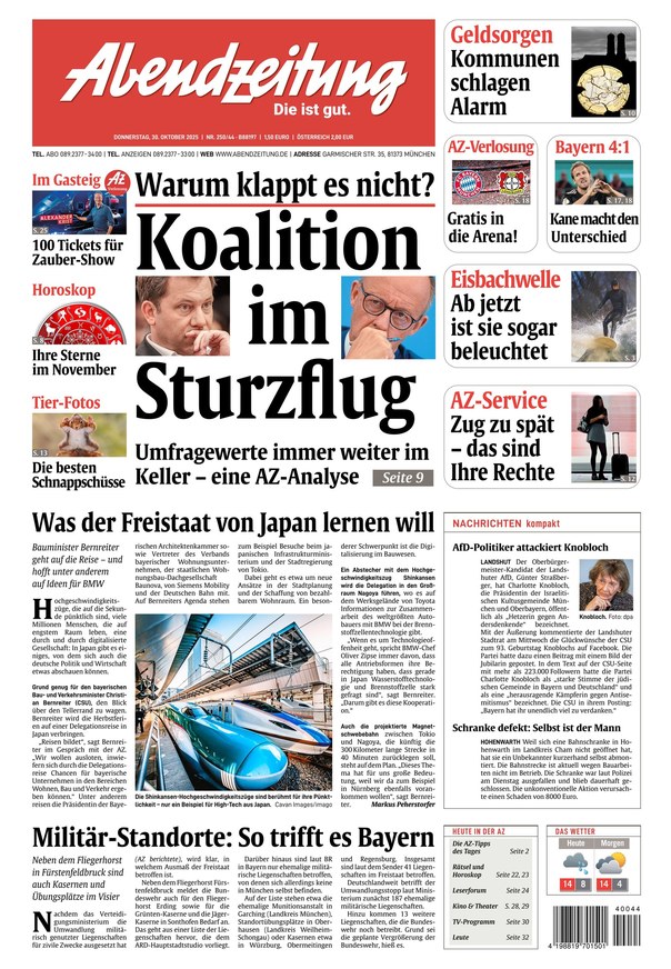 In der Abendzeitung München finden Sie längere Artikel als in anderen Boulevard-Zeitungen, ergänzt werden diese durch übersichtlich aufbereitete Kompakt-News. Hier wird auf den Punkt gebracht, was die Leser interessiert. Erfahren Sie alles über die wichtigsten Nachrichten und Themen des Tages - aus München, Bayern, Deutschland, Europa und der Welt. In treffsicheren Kommentaren und Kolumnen gibt die Redaktion ihre Meinung wieder und bietet Standpunkte und Orientierung zu Top-Themen und Brisantem.