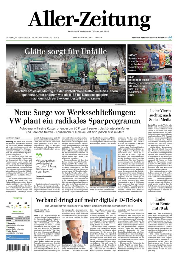 Die Aller-Zeitung berichtet von Montag bis Sonntag über alles, was im Landkreis Gifhorn und darüber hinaus wichtig ist. Nachrichten aus Gifhorn, Brome, Meinersen, Isenbüttel, Papenteich, Wesendorf, Sassenburg und dem Boldecker Land sorgen dafür, dass Sie über alle wichtigen Themen auf dem Laufenden bleiben. Besonders praktisch: Das ePaper der Tageszeitung ist online lesbar und als PDF downloadbar.