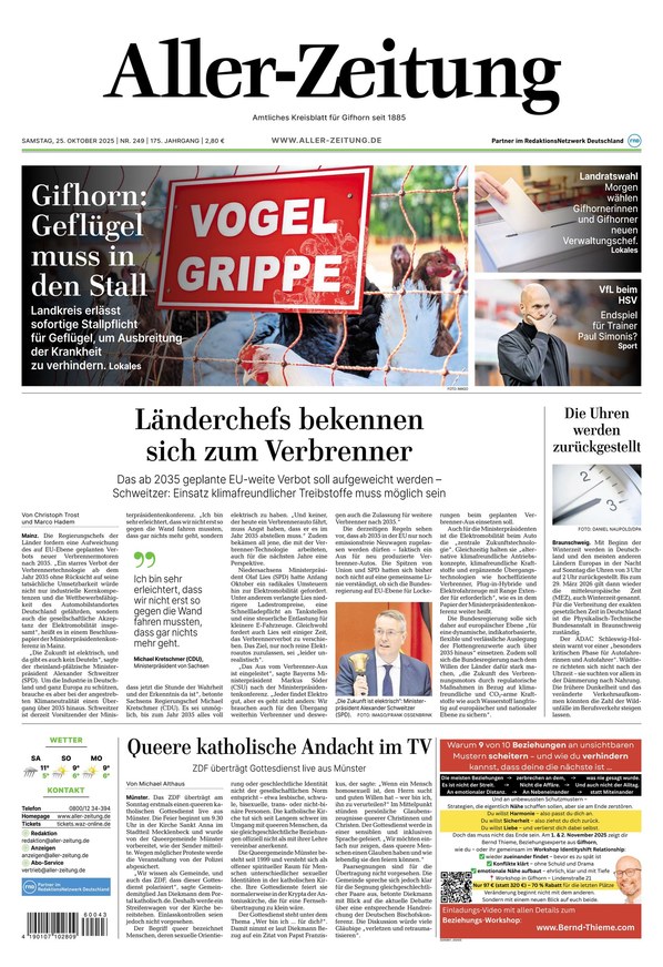 Die Aller-Zeitung berichtet von Montag bis Sonntag über alles, was im Landkreis Gifhorn und darüber hinaus wichtig ist. Nachrichten aus Gifhorn, Brome, Meinersen, Isenbüttel, Papenteich, Wesendorf, Sassenburg und dem Boldecker Land sorgen dafür, dass Sie über alle wichtigen Themen auf dem Laufenden bleiben. Besonders praktisch: Das ePaper der Tageszeitung ist online lesbar und als PDF downloadbar.