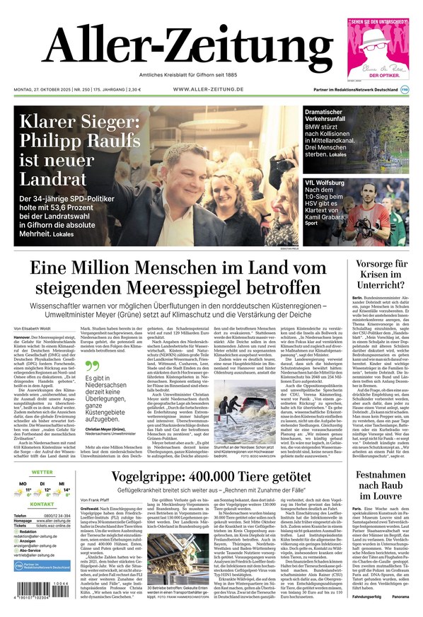 Die Aller-Zeitung berichtet von Montag bis Sonntag über alles, was im Landkreis Gifhorn und darüber hinaus wichtig ist. Nachrichten aus Gifhorn, Brome, Meinersen, Isenbüttel, Papenteich, Wesendorf, Sassenburg und dem Boldecker Land sorgen dafür, dass Sie über alle wichtigen Themen auf dem Laufenden bleiben. Besonders praktisch: Das ePaper der Tageszeitung ist online lesbar und als PDF downloadbar.