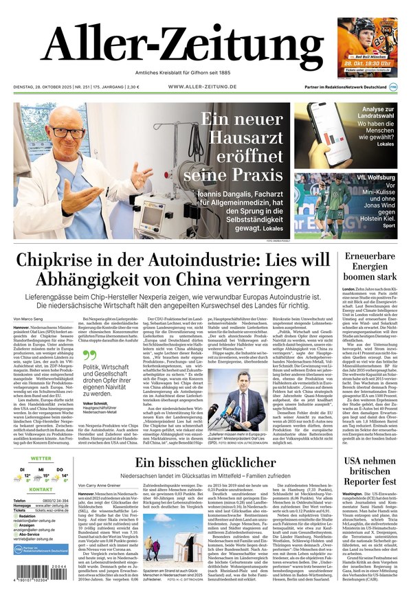 Die Aller-Zeitung berichtet von Montag bis Sonntag über alles, was im Landkreis Gifhorn und darüber hinaus wichtig ist. Nachrichten aus Gifhorn, Brome, Meinersen, Isenbüttel, Papenteich, Wesendorf, Sassenburg und dem Boldecker Land sorgen dafür, dass Sie über alle wichtigen Themen auf dem Laufenden bleiben. Besonders praktisch: Das ePaper der Tageszeitung ist online lesbar und als PDF downloadbar.