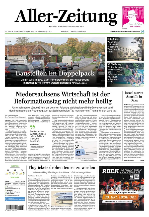 Die Aller-Zeitung berichtet von Montag bis Sonntag über alles, was im Landkreis Gifhorn und darüber hinaus wichtig ist. Nachrichten aus Gifhorn, Brome, Meinersen, Isenbüttel, Papenteich, Wesendorf, Sassenburg und dem Boldecker Land sorgen dafür, dass Sie über alle wichtigen Themen auf dem Laufenden bleiben. Besonders praktisch: Das ePaper der Tageszeitung ist online lesbar und als PDF downloadbar.