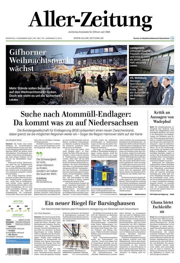 Die Aller-Zeitung berichtet von Montag bis Sonntag über alles, was im Landkreis Gifhorn und darüber hinaus wichtig ist. Nachrichten aus Gifhorn, Brome, Meinersen, Isenbüttel, Papenteich, Wesendorf, Sassenburg und dem Boldecker Land sorgen dafür, dass Sie über alle wichtigen Themen auf dem Laufenden bleiben. Besonders praktisch: Das ePaper der Tageszeitung ist online lesbar und als PDF downloadbar.