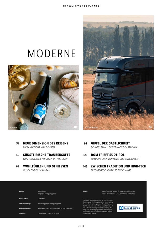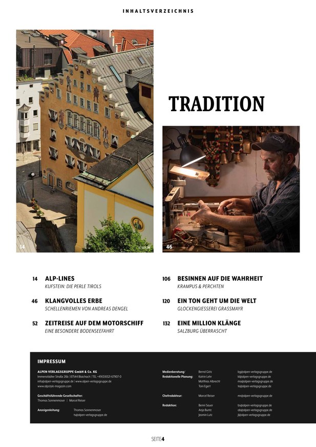 Wo Tradition und Moderne verschmelzen. Wer die Alpen liebt und unsere Affinität zum exklusiven Lebensstil teilt, ist bei ALPSTYLE genau richtig. ALPSTYLE ist mehr als ein hochwertiges Magazin. ALPSTYLE verkörpert den alpinen Lifestyle und das Genießen mit allen Sinnen in einem einzigartigen Konzept. Für Frauen und Männer mit Stil. Für Alpenliebhaber. Für Genussmenschen. Kurz: für ALPSTYLER. ALPSTYLE portraitiert die Alpen. In ihrer Vielfalt. In ihrem Glanz. Mit ihren Menschen. Mit allen Facetten. Die Alpen und die Menschen, die hier leben, sind aber nicht nur voller alter Geschichten. Sie sind auch innovativ, stylisch und luxuriös. Deshalb bildet ALPSTYLE den Spagat aus Tradition & Moderne wie kein anderes Magazin ab. Attraktiv. Verlockend. Stilvoll. Das ist ALPSTYLE. Das lieben ALPSTYLER.