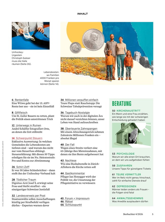 Die Themenvielfalt vom Beobachter ist groß und hält für jeden Leser einen passenden Beitrag bereit. Erfahren Sie beispielsweise, wie Sie das richtige Unternehmen für Ihren Umzug finden, wie es sich mit den Bildrechten in Zeiten von Facebook und Twitter verhält oder lesen Sie im Ratgeberteil des Beobachters, welche psychologischen Prozesse ins Rollen gebracht werden, wenn Sie Angst oder Freude verspüren. Gleichzeitig bietet der Beobachter aber nicht nur nützliche Hilfestellungen und Ratgeber, sondern wirft auch einen kritischen Blick auf den aktuellen Markt. Im Fokus steht darüber hinaus jeweils ein Titelthema pro Ausgabe, das sich einem bestimmten Feld widmet und besonders umfangreich im Heft behandelt wird.