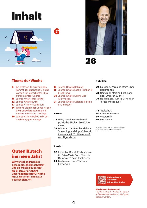 Das Börsenblatt können Sie hier im iKiosk wöchentlich als ePaper direkt lesen und als PDF herunterladen. So oder so, von unterwegs ist es bequem auf dem Smartphone oder Tablet zu lesen. Außerdem können Sie hier die Such- und Zoomfunktion nutzen, um nach einem bestimmten Titel zu suchen oder Grafiken zu vergrößern.