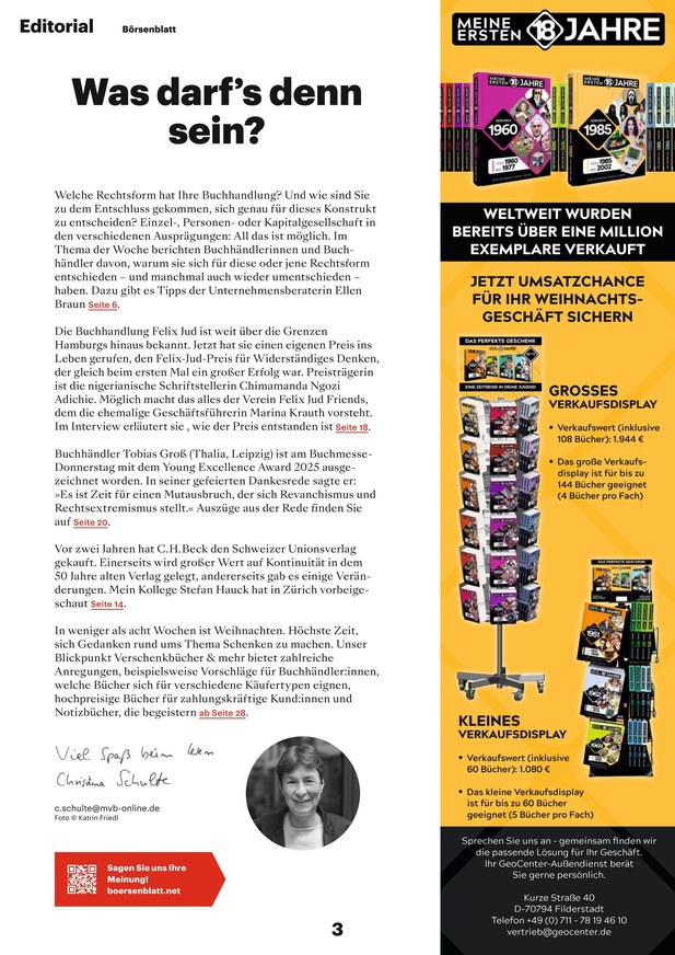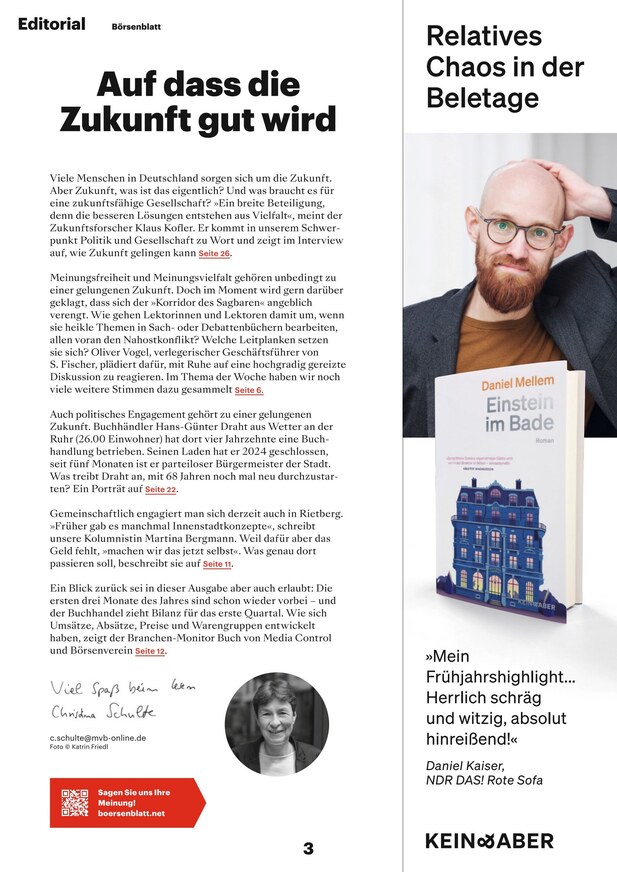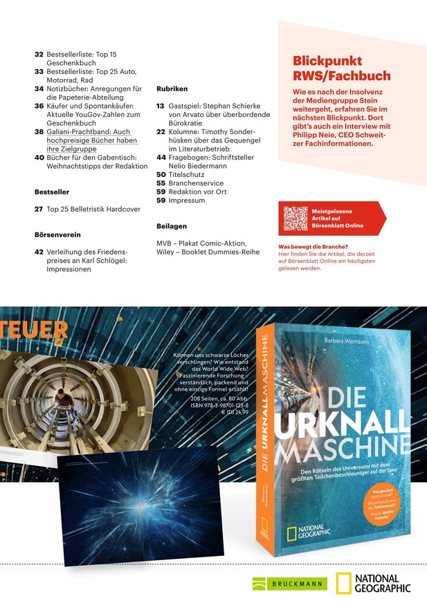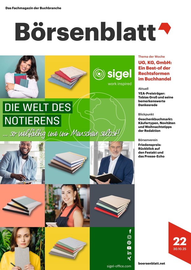Das Börsenblatt ist ein Fachmagazin für die Buchbranche. Es erscheint seit 2013 wöchentlich im Wechsel als Börsenblatt Magazin und Börsenblatt Spezial. Hier im iKiosk lässt sich die aktuelle Ausgabe herunterladen und bequem auch unterwegs lesen.