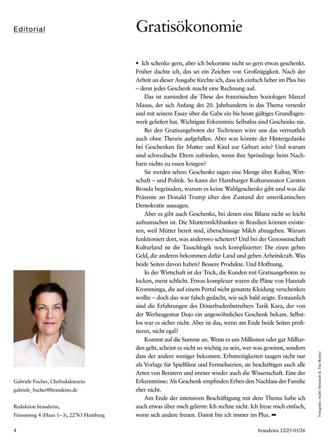 Vor über 20 Jahren ist brand eins angetreten, die Ablösung der Industrie- durch die Wissensgesellschaft zu begleiten, und durch Beispiele zu zeigen, wie unser aller Leben dadurch besser werden kann. brand eins interessiert nicht der Status quo, sondern das, was sich entwickelt. Das Magazin sucht nach Menschen, Ideen und Unternehmen, die in Wirtschaft, Gesellschaft und Kultur etwas voranbringen.