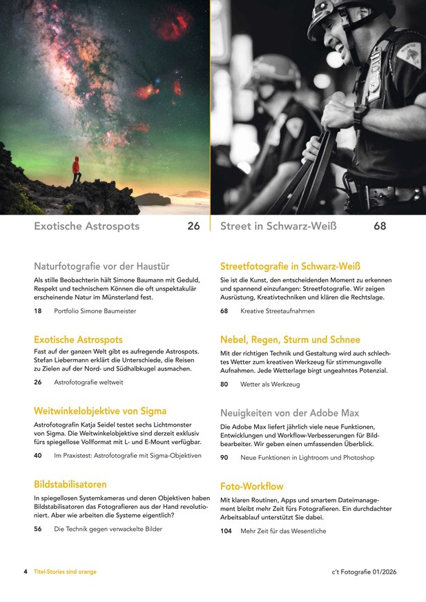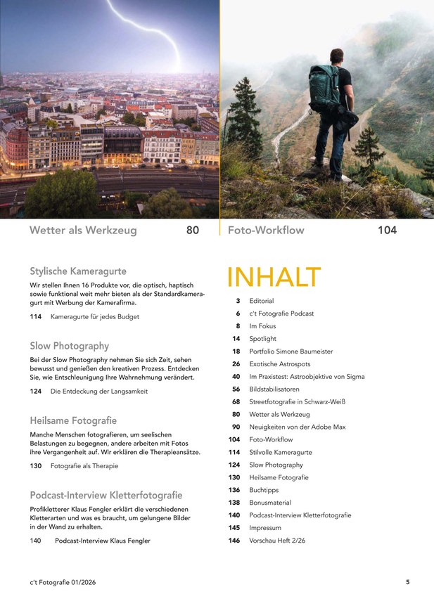Mit aktuellen News, ausführlichen Datenblättern und umfassenden Praxis- sowie Produktberichten ist c't Digitale Fotografie Ihr Fachmagazin rund um das digitale Bild. In hauseigenen Mess- und Testlabors stellt c't Digitale Fotografie Kameras, Objektive und Zubehör genauestens auf den Prüfstand. Dabei testet die Redaktion allerdings nicht wahllos, sondern konzentriert sich auf eine Auswahl der wichtigsten Neuerscheinungen. Berichte über Fotozubehör, darunter Blitze, Stative, Studio-Equipment, Fototaschen  oder -rucksäcke, runden jede Ausgabe des c't Digitale Fotografie-ePapers ab.
