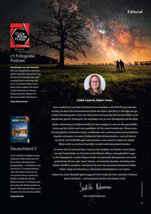 Als eine der auflagenstärksten Fotozeitschriften in Deutschland zeichnet sich c't Digitale Fotografie durch außergewöhnlich kompetente Workshops zum Thema Fotografieren aus. Ob Unterwasserfotografie, Lichtmalerei oder Gestaltung mit Schärfe: Erfahren Sie im ePaper, wie Sie Ihre fotografischen Fähigkeiten verbessern. Auch das Thema Fotodruck darf in keinem Heft fehlen - c't Digitale Fotografie versorgt Profis und Hobbyfotografen alle vierzehn Tage mit Tipps zu Drucker, Papier, Dienstleister oder Fotobuch.