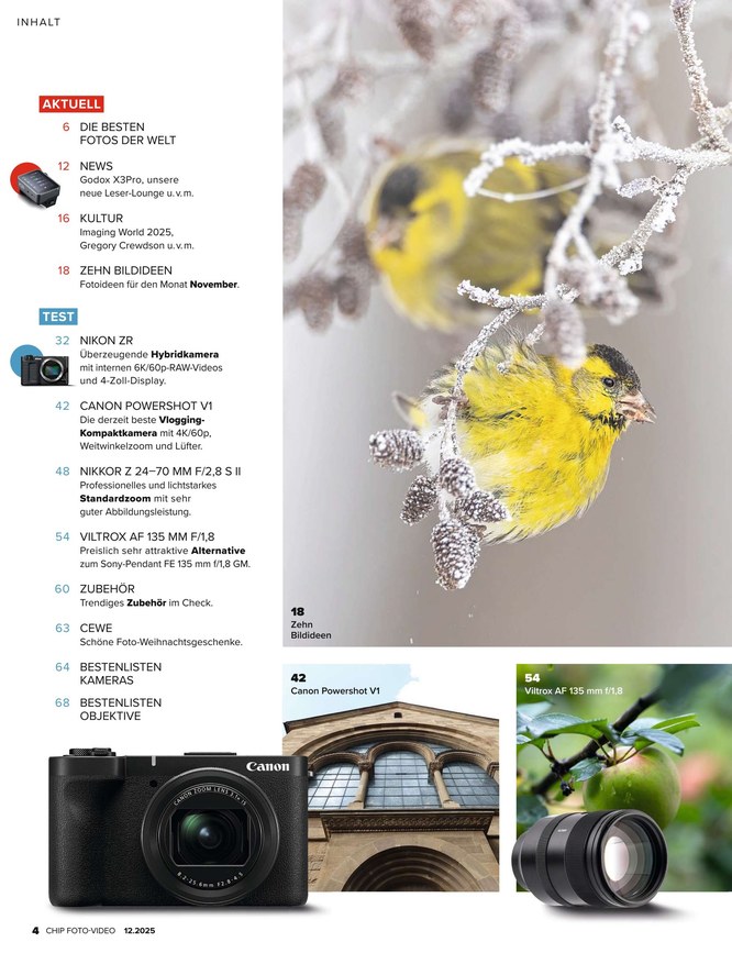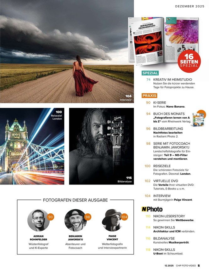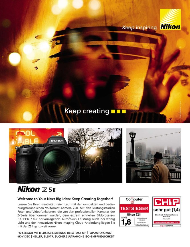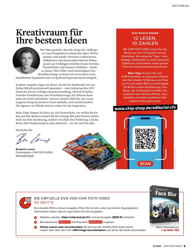 Mit CHIP FOTO VIDEO werden Sie von Ausgabe zu Ausgabe zu einem besseren Fotografen und Filmemacher. Der treibende Motor der Zeitschrift sind Inspiration und Befähigung. Lernen Sie kreative Techniken kennen und kommen Sie auf neue Ideen. Das Magazin setzt auf Tipps, die jeder nachmachen kann und erklärt, wie Sie das Beste aus Ihrer Kamera herausholen. Erfahren Sie mehr zu Themen wie Timing, Beleuchtung und Perspektive oder stoßen Sie auf neue Herangehensweisen in den Bereichen Natur- und Tierfotos sowie Landschaftsaufnahmen. Saisonale Themenschwerpunkte sorgen dafür, dass Sie Foto-Projekte für jede Jahreszeit vorfinden. Neben den Foto- und Video-Tipps finden Sie in CHIP FOTO VIDEO praxisnahe Kameratests und Zubehör-Vorstellungen. Die Geräte werden auf ihre Alltagstauglichkeit überprüft und von der fachkompetenten Redaktion kritisch unter die Lupe genommen.