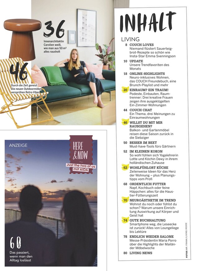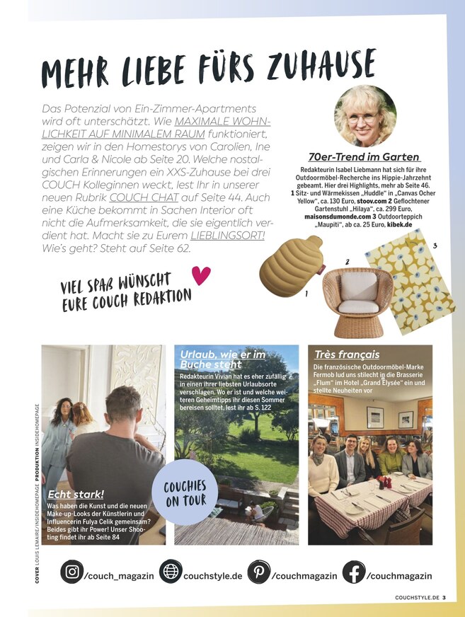 COUCH ist Ihr praktisches Pocket-Format für alle spannenden Themen rund um Wohnen und Fashion. Damit füllt es gekonnt die Lücke zwischen klassischen Wohnzeitschriften und jungen Lifestylemagazinen. Weiterlesen...