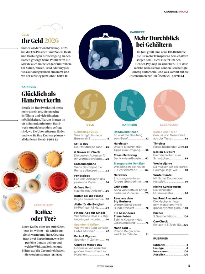 Es geht um Mut, Inspiration, Neugier und ein großes Maß an Unabhängigkeit. Denn die Frau von heute interessiert sich neben Familie und Freundschaften immer für die Finanzwelt. Doch warum haben Sie einen solchen Respekt vor dieser Aufgabe? Die Trend Themen wie Money Mindset, New Work und Gender-Pay-Gap werden ausreichend in Courage besprochen und helfen so den Leserinnen beim großdenken und sich trauen. Neben Interviews mit erfolgreichen Frauen, die ihre Ratschläge teilen, gibt es auch viele Einblicke in Spartipps und Karrierebooster.