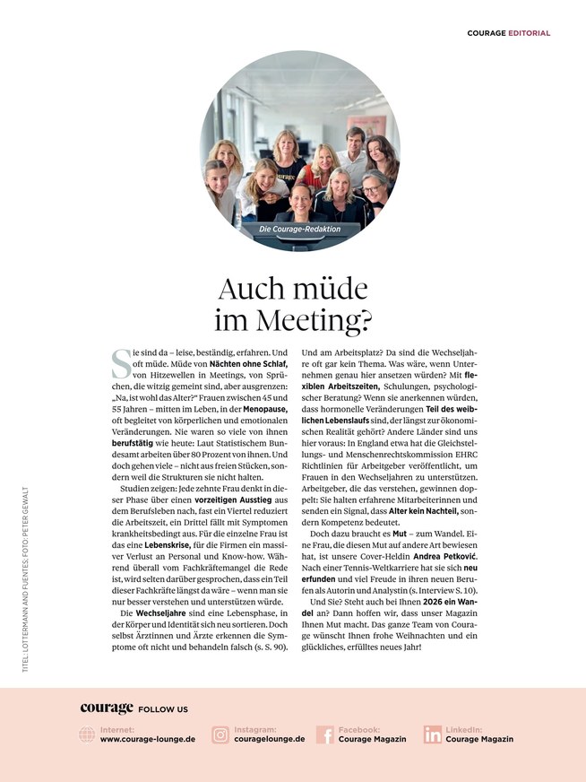 Courage ist die erste Zeitschrift, die sich thematisch an Frauen richtet und die Themen Finanzen und Karriere beleuchtet. Sie erscheint in der Holderstock Media GmbH und bringt alle zwei Monate die Leserinnen und Leser dazu, gewohnte Muster zu hinterfragen und mutig zu sein. Weiterlesen...