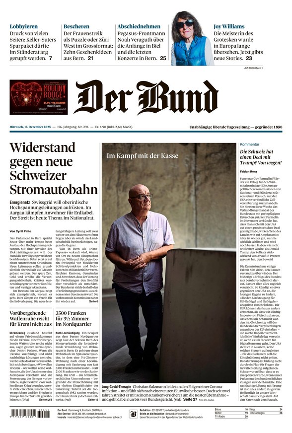 Der Bund ist seit 170 Jahren die Tageszeitung der Bundeshauptstadt Bern. Mit Hintergrundberichten und Analysen aus Politik, Wirtschaft, Lokalem, Kultur und Sport sowie Reportagen und pointierten Kommentaren bietet der Traditionstitel täglich aktuelles Lesevergnügen.