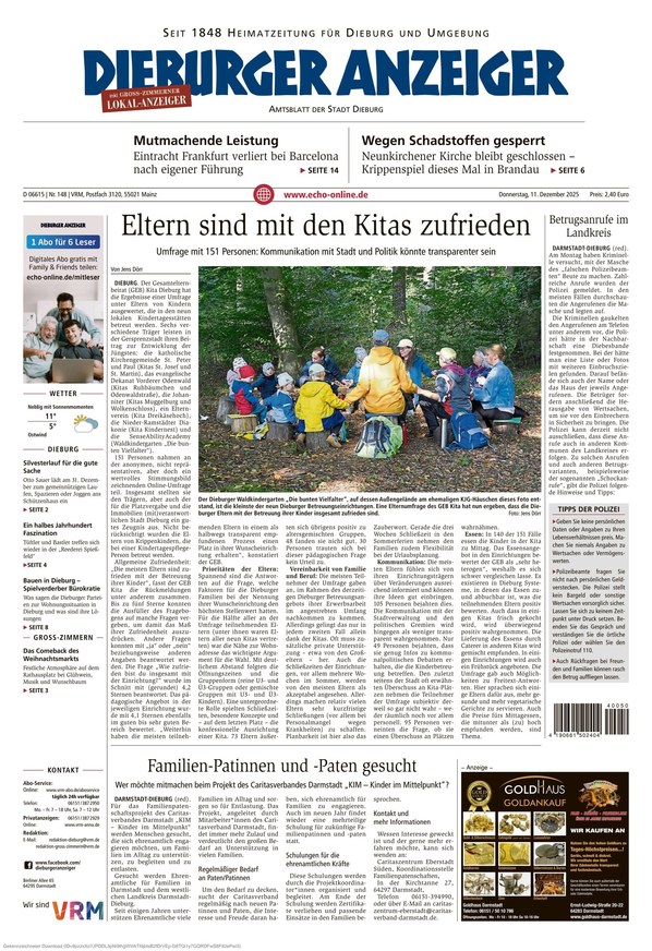 Der Dieburger Anzeiger ist Ihre traditionsreiche lokale Zeitung, die Sie regelmäßig mit den neuesten Nachrichten und spannenden Berichten aus Dieburg und der umliegenden Region versorgt. Zusätzlich bietet er Ihnen überregionale News aus Politik, Wirtschaft, Kultur und Sport. Weiterlesen...