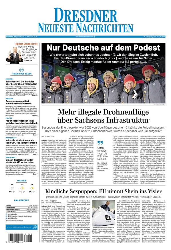 Alle Nachrichten aus Dresden und Umgebung finden Sie täglich in der DNN (Dresdner Neueste Nachrichten): Politik, Wirtschaft, Kultur, Sport und mehr. Das ePaper erscheint täglich von Montag bis Sonntag und ist in allen Inhalten mit der gedruckten Zeitung identisch. Sie erhalten mit der digitalen Ausgabe die gewohnte Qualität Ihrer Tageszeitung, können jedoch zusätzlich Features wie Suchfunktion oder Zoom nutzen.