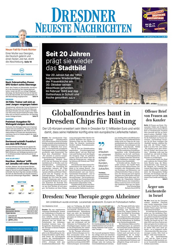 Alle Nachrichten aus Dresden und Umgebung finden Sie täglich in der DNN (Dresdner Neueste Nachrichten): Politik, Wirtschaft, Kultur, Sport und mehr. Das ePaper erscheint täglich von Montag bis Sonntag und ist in allen Inhalten mit der gedruckten Zeitung identisch. Sie erhalten mit der digitalen Ausgabe die gewohnte Qualität Ihrer Tageszeitung, können jedoch zusätzlich Features wie Suchfunktion oder Zoom nutzen.