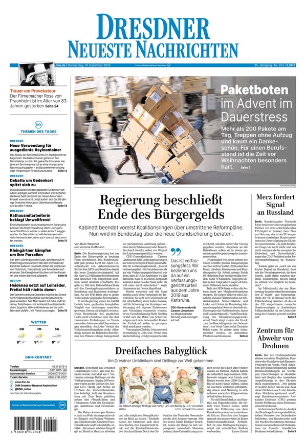 Alle Nachrichten aus Dresden und Umgebung finden Sie täglich in der DNN (Dresdner Neueste Nachrichten): Politik, Wirtschaft, Kultur, Sport und mehr. Das ePaper erscheint täglich von Montag bis Sonntag und ist in allen Inhalten mit der gedruckten Zeitung identisch. Sie erhalten mit der digitalen Ausgabe die gewohnte Qualität Ihrer Tageszeitung, können jedoch zusätzlich Features wie Suchfunktion oder Zoom nutzen.