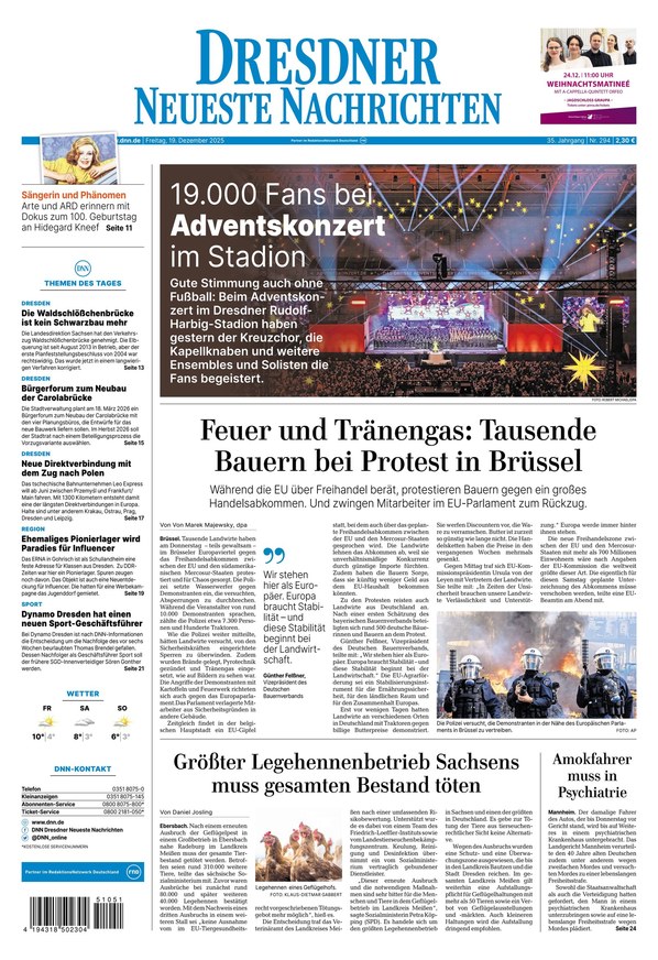 Alle Nachrichten aus Dresden und Umgebung finden Sie täglich in der DNN (Dresdner Neueste Nachrichten): Politik, Wirtschaft, Kultur, Sport und mehr. Das ePaper erscheint täglich von Montag bis Sonntag und ist in allen Inhalten mit der gedruckten Zeitung identisch. Sie erhalten mit der digitalen Ausgabe die gewohnte Qualität Ihrer Tageszeitung, können jedoch zusätzlich Features wie Suchfunktion oder Zoom nutzen.