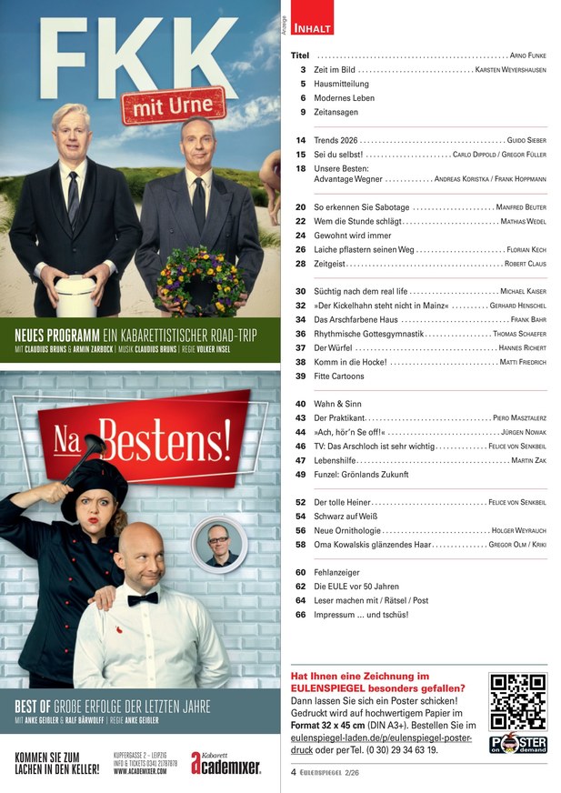 Das Humor- und Satiremagazin EULENSPIEGEL ist vor allem politisch ausgerichtet und legt einen besonderen Schwerpunkt auf Themen der DDR bzw. die DDR-Vergangenheit. Weiterlesen...