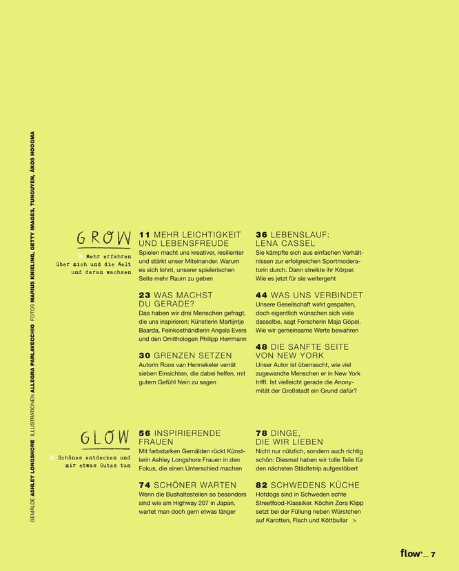 Flow ist das Magazin für Achtsamkeit, Positive Psychologie und Selbstgemachtes. In acht Ausgaben pro Jahr bekommen Sie als Leser spannende Interviews, detailverliebte Portraits, Infos über aktuelle Trends, DIY-Anleitungen, Rezepte und vieles mehr. Flow ist auch als ePaper verfügbar und kann somit bequem am Computer, Laptop, Tablet oder auf dem Smartphone gelesen werden.
