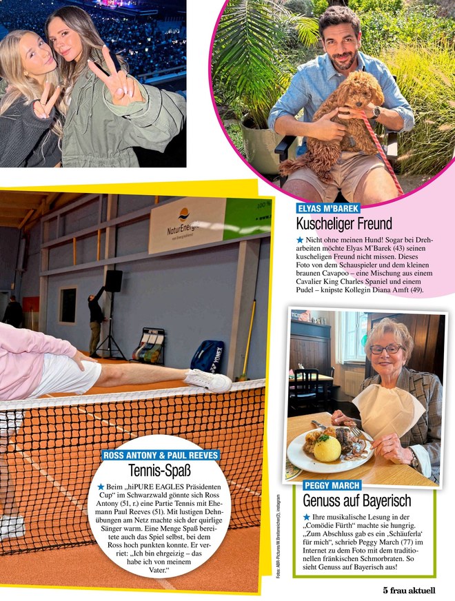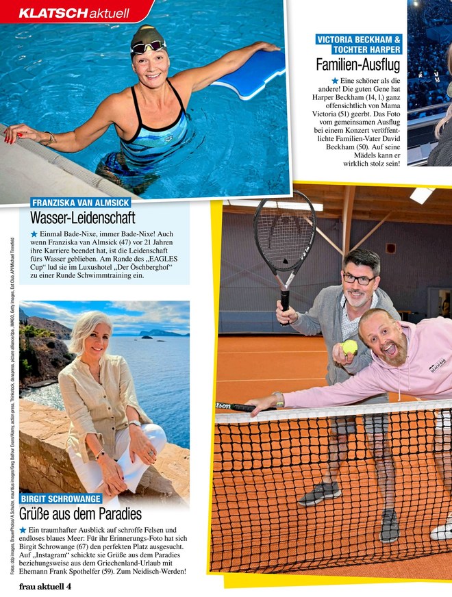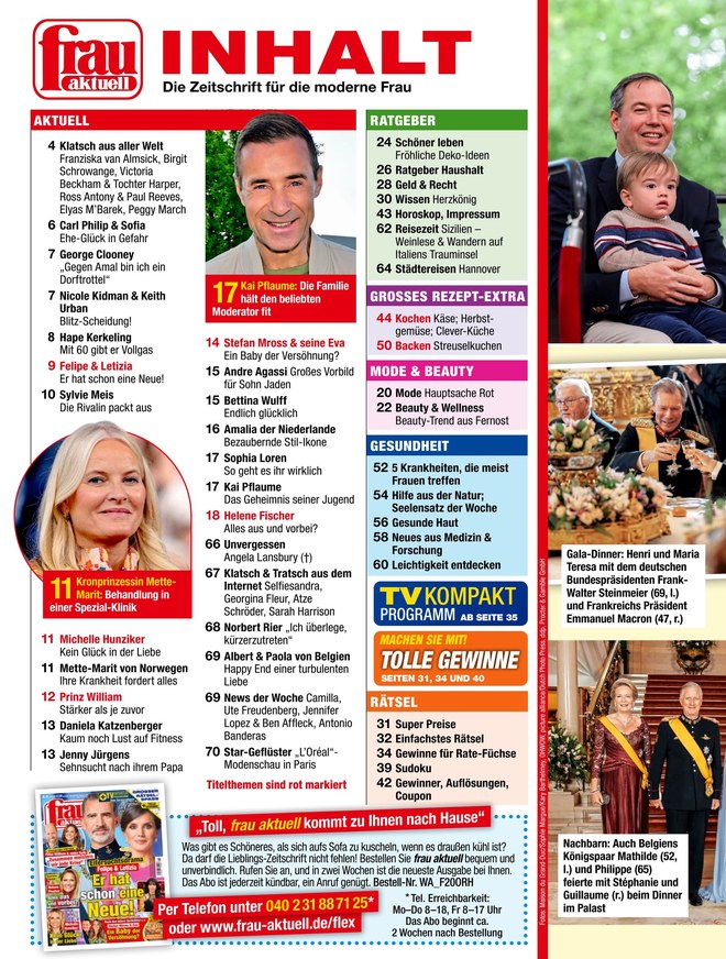 Spannende Reportagen, exklusive Interviews und die schönsten Fotos von Prominenten aus Gesellschaft, Film, Show und Adel - dafür steht frau aktuell. Im ePaper finden Sie Montag für Montag die folgenden Ressorts:
