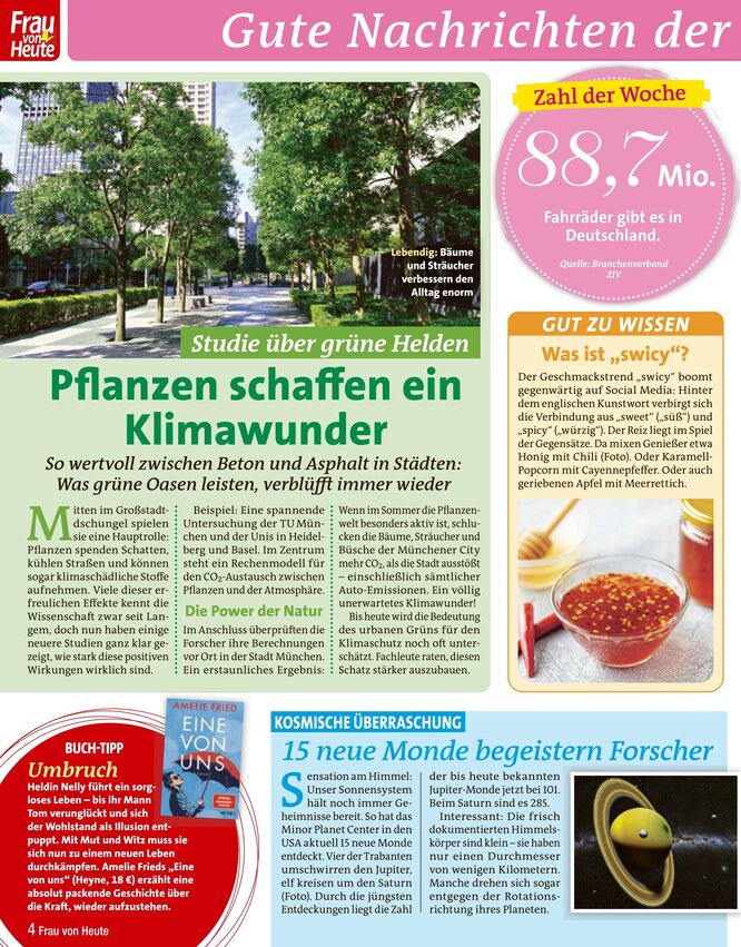 In jedem Heft nimmt sich die Redaktion der Frau von Heute neue Trends und Themen vor: Ob Lebensmittelskandal oder Änderung im Unterhaltsrecht - mit dem "Top-Thema der Woche" sind Sie als Frau von Heute-Leserin stets umfassend informiert. Das ePaper bewegt mit authentischen Schicksalen und emotionalen Frauen-Porträts, praktische Alltagshilfe bietet zudem ein ausführlicher Ratgeber-Teil. In der Frau von Heute finden Sie Wissenswertes rund um Schulmedizin und alternative Heilmethoden - der "Diät-Ratgeber" liefert nicht nur verlässliche Informationen zum gesunden Abnehmen, hier stellen Leserinnen auch ihre Erfolgsgeschichten vor.