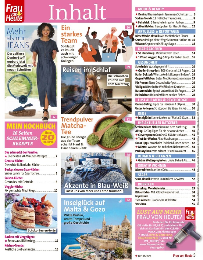 Frau von Heute bietet Inspiration für jeden Wochentag - angefangen bei leckeren Gerichten und süßen Backideen bis hin zu tragbarer Mode und tollen "Große Größen"-Stylingtricks. Das Frau von Heute-ePaper unterhält jede Woche mit folgenden Ressorts: