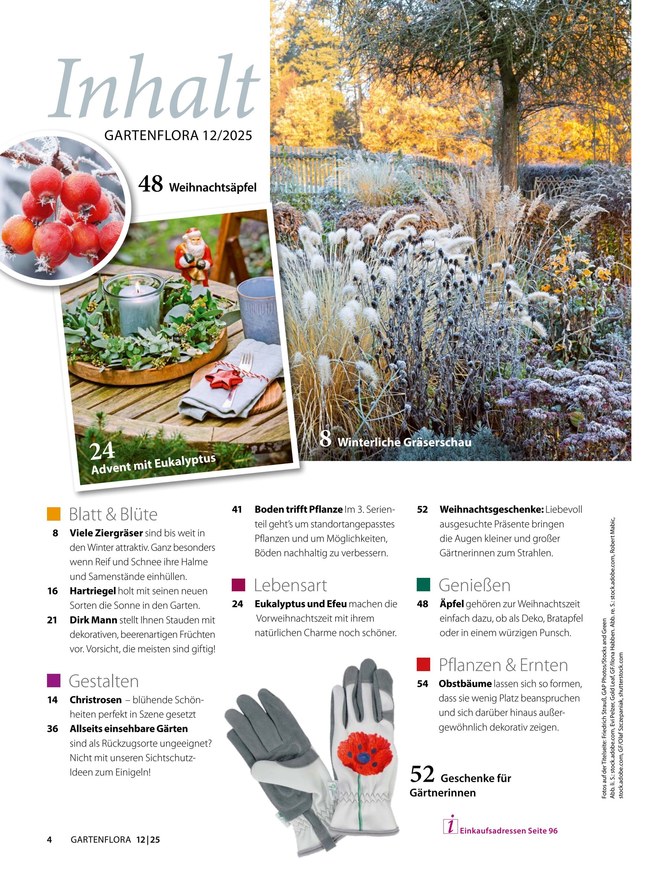 Bei GartenFlora dreht sich alles um den heimischen Garten, die richtige Pflege der Grünpflanzen und eine moderne, stilvolle Gestaltung des Outdoor-Bereichs. Praxisbezogen und verständlich ist sie eine Hilfe für erfolgreiches Gärtnern und berichtet in ausführlichen, reich bebilderten Artikeln über Zier- und Nutzgärten oder außergewöhnlich gestaltete Privatgärten. Abgerundet wird das Angebot durch viele Ratgeber, Anleitungen, Vergleiche, Tests und mehr. Möchten Sie die GartenFlora lesen, dann finden Sie die neueste Ausgabe hier im iKiosk als ePaper oder PDF zum Download. Das Magazin erscheint im monatlichen Rhythmus und ist entweder als Einzelausgabe, mit einer Laufzeit von drei Monaten oder als Jahresabonnement erhältlich.