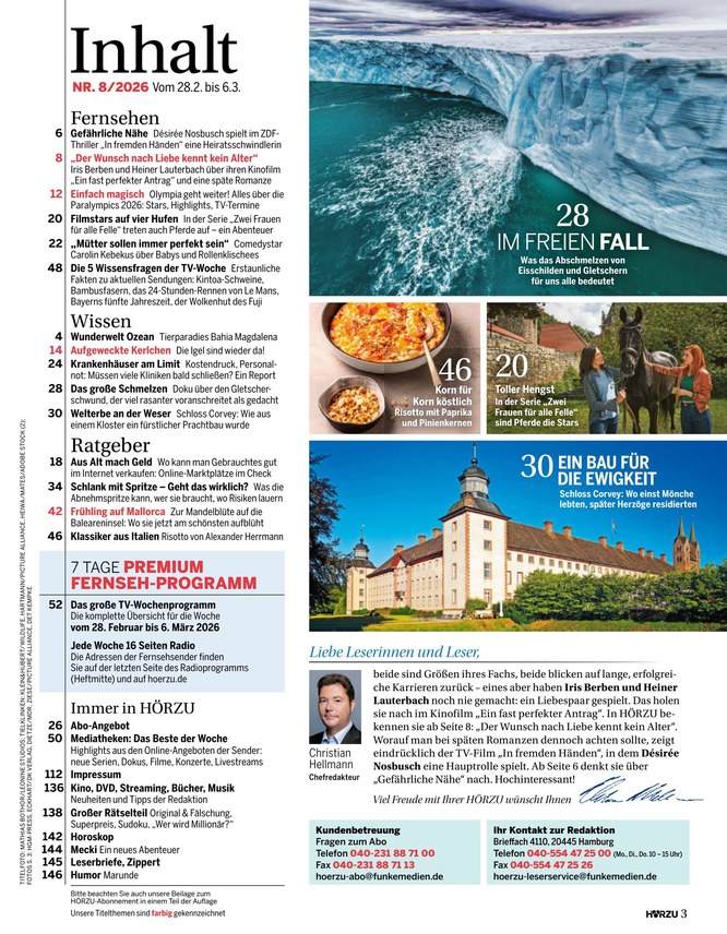 Die TV-Zeitschrift HÖRZU erscheint wöchentlich und ist auch als ePaper erhältlich. Alle wichtigen TV-Sender sind enthalten, das Programm wird übersichtlich dargestellt und bietet Orientierung auf einen Blick. Neben dem umfassenden Programmteil enthält die Fernsehzeitschrift Hintergrundgeschichten zu aktuellen TV- und Kinoproduktionen, sowie spannende Reportagen aus den Bereichen Natur, Reise, Technik, Umwelt und Wissenschaft. Ergänzt wird die Berichterstattung durch Ratgeber-Beiträge zu Themen rund um Gesundheit, Wellness, Finanzen, Recht und Familie.
