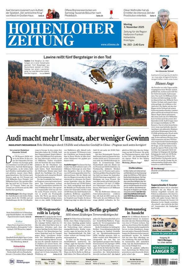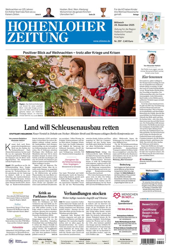 Die Region im Herzen, die Welt im Blick – das ist die Mission der Hohenloher Zeitung. Lesen Sie faktenbasiert über aktuelle Nachrichten und Themen und erfahren Sie, welche Auswirkungen diese auf Hohenlohe haben. Rund 100 Redakteure arbeiten in der Vollredaktion und befüllen die sieben Lokalausgaben. Zudem verfügt das Medienunternehmen über Redaktionsbüros in Stuttgart, Berlin und Brüssel sowie Korrespondenten in Washington, New York, London, Moskau, Paris, Warschau, Ankara, Madrid und St. Petersburg.