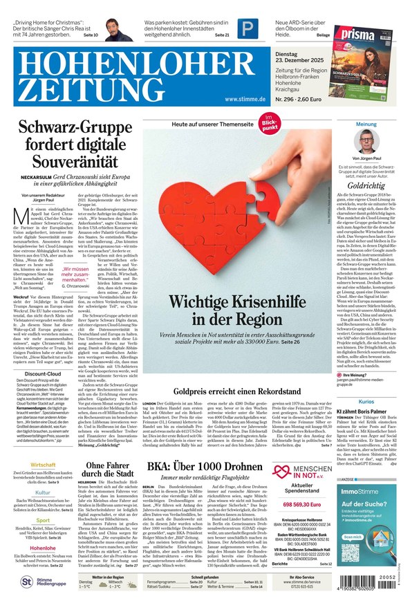Die Region im Herzen, die Welt im Blick – das ist die Mission der Hohenloher Zeitung. Lesen Sie faktenbasiert über aktuelle Nachrichten und Themen und erfahren Sie, welche Auswirkungen diese auf Hohenlohe haben. Rund 100 Redakteure arbeiten in der Vollredaktion und befüllen die sieben Lokalausgaben. Zudem verfügt das Medienunternehmen über Redaktionsbüros in Stuttgart, Berlin und Brüssel sowie Korrespondenten in Washington, New York, London, Moskau, Paris, Warschau, Ankara, Madrid und St. Petersburg.
