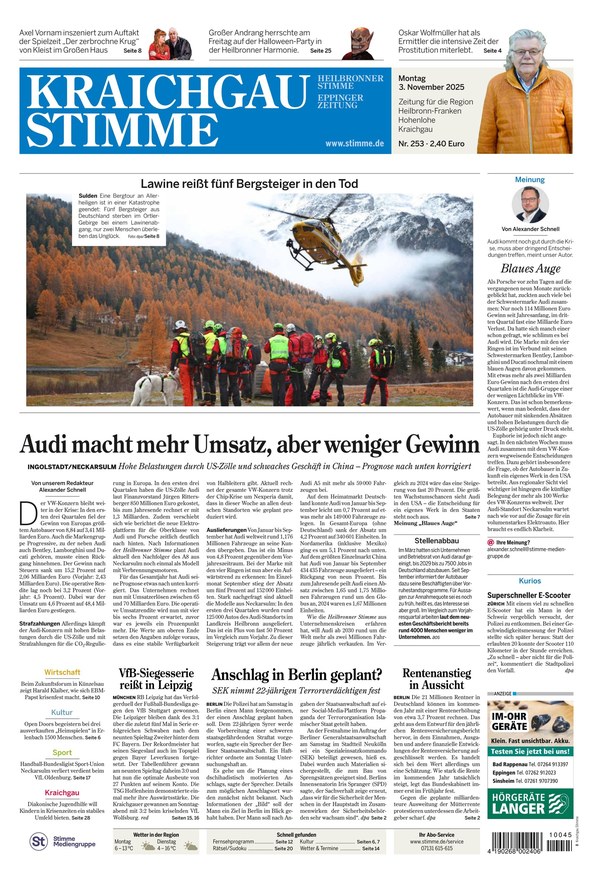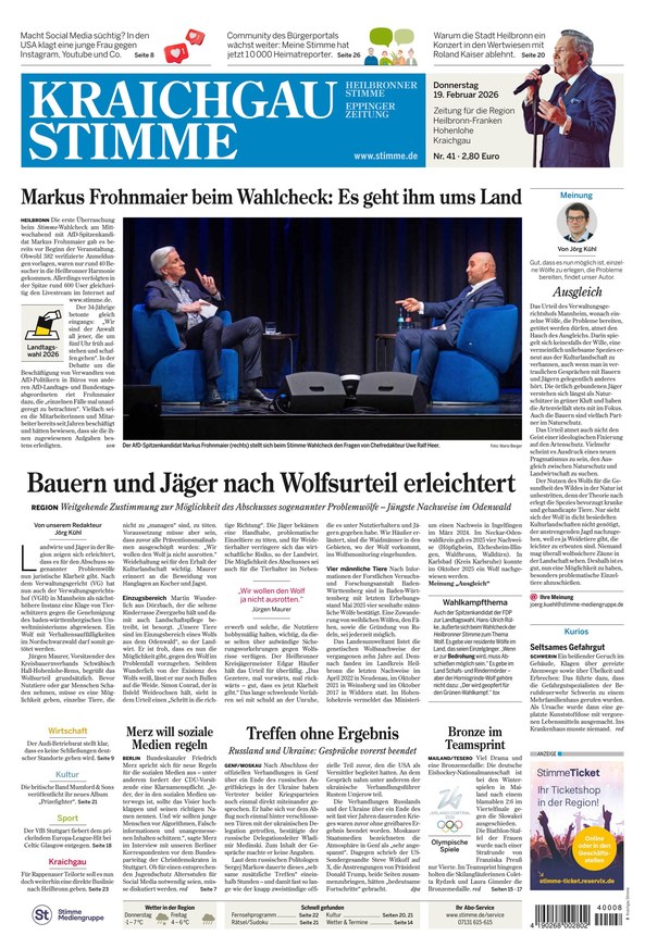 Das E-Paper ist die digitale Ausgabe Ihrer Kraichgau Stimme und versorgt Sie von Montag bis Samstag zuverlässig mit Nachrichten, Neuigkeiten, Hintergrundgeschichten und Reportagen der Regionen Heilbronn, Hohenlohe und Kraichgau sowie der Welt. Neben den Ressorts Wirtschaft, Kultur, Sport und Region erhalten Sie außerdem fundiert recherchierte Service-Themen und übersichtliche Terminankündigungen.