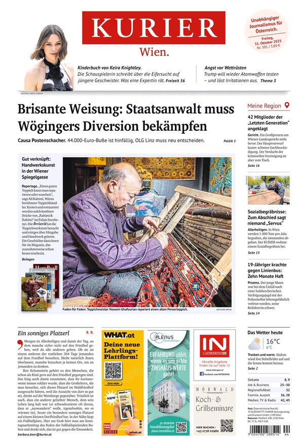 Die österreichische Tageszeitung Kurier berichtet über alle wichtigen Nachrichten aus Wien, Österreich und der Welt. Bleiben Sie mit dem ePaper über alle relevanten Themen informiert. Weiterlesen...