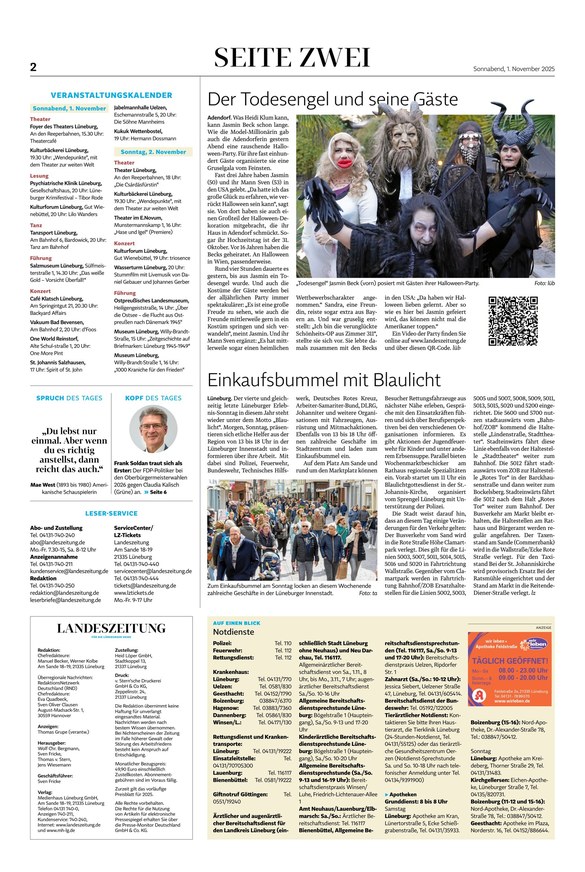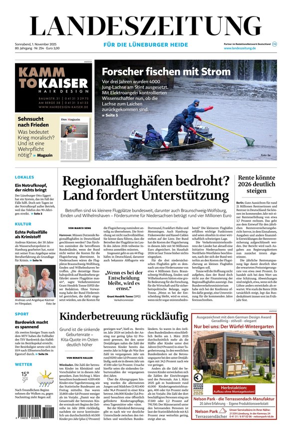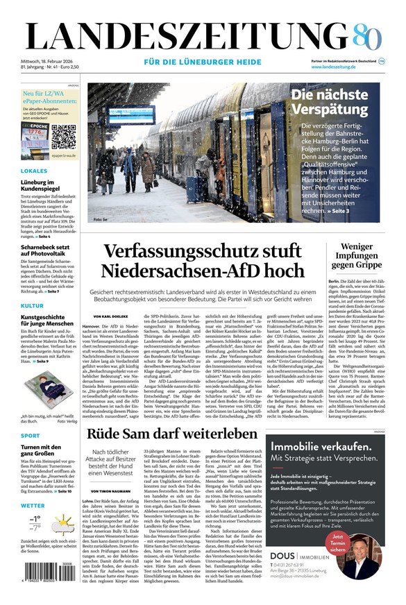 Alle Nachrichten aus Lüneburg, der Lüneburger Heide, Niedersachsen, Deutschland und der Welt finden Sie von Montag bis Samstag in der Landeszeitung für die Lüneburger Heide (LZ). Das ePaper der Tageszeitung aus Lüneburg punktet mit einer täglichen Kinderseite, einem Wochenend-Magazin, dem Interview der Woche, sowie täglichen Kommentaren.