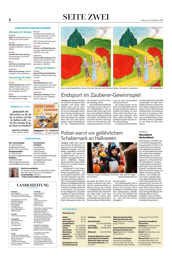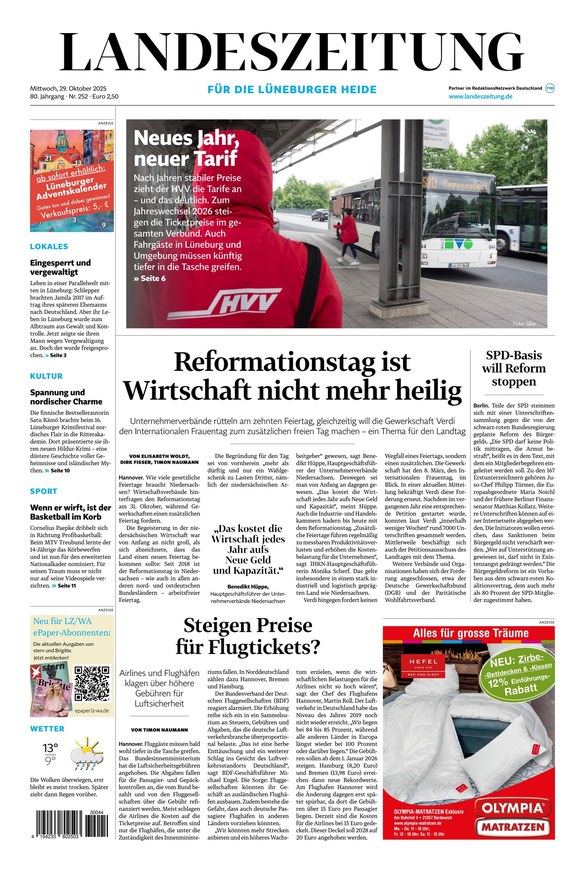 Alle Nachrichten aus Lüneburg, der Lüneburger Heide, Niedersachsen, Deutschland und der Welt finden Sie von Montag bis Samstag in der Landeszeitung für die Lüneburger Heide (LZ). Das ePaper der Tageszeitung aus Lüneburg punktet mit einer täglichen Kinderseite, einem Wochenend-Magazin, dem Interview der Woche, sowie täglichen Kommentaren.