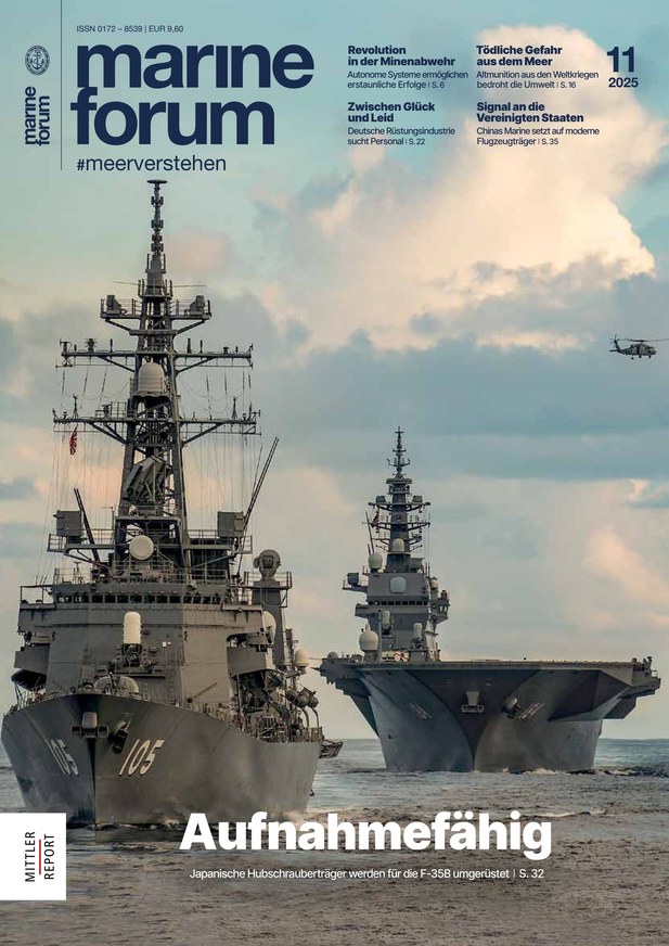 Marine Forum ist das deutsche Fachmagazin für maritime Themen. Das Magazin punktet mit abwechslungsreichen Titelgeschichten: Erfahren Sie mehr über Schiffbau an verschiedenen Standorten in Deutschland, Hubschrauber der Marine und Themen wie Seeraumüberwachung, Sicherheitspolitik, Technologie, Meeresforschung und Seefahrts- und Marinegeschichte. Die Redaktion berichtet regelmäßig über die deutsche Marine und Marinen anderer Nationen, sowie rüstungswirtschaftliche Zusammenhänge und Seerecht. Zusätzlich wird fachbezogene Literatur vorgestellt.