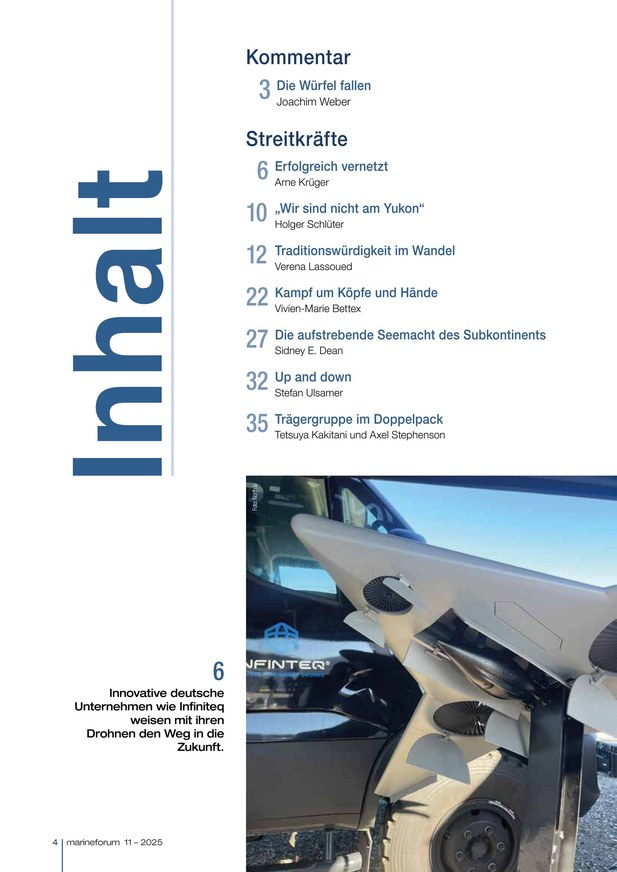 Bereits auf der Titelseite verspricht Marine Forum, dass Sie mit dem ePaper das "Das maritime Geschehen im Blick" behalten. Dieses Versprechen können Sie beim Wort nehmen, denn in der digitalen Ausgabe der Publikation erfahren Sie jeden Monat das Wichtigste aus den Themenbereichen Maritime Sicherheitspolitik, Seestrategie, Marinetechnik, Marinepolitik und Marinegeschichte. Nutzen Sie Smartphone, Tablet oder Computer, um das ePaper von Marine Forum online zu lesen.
