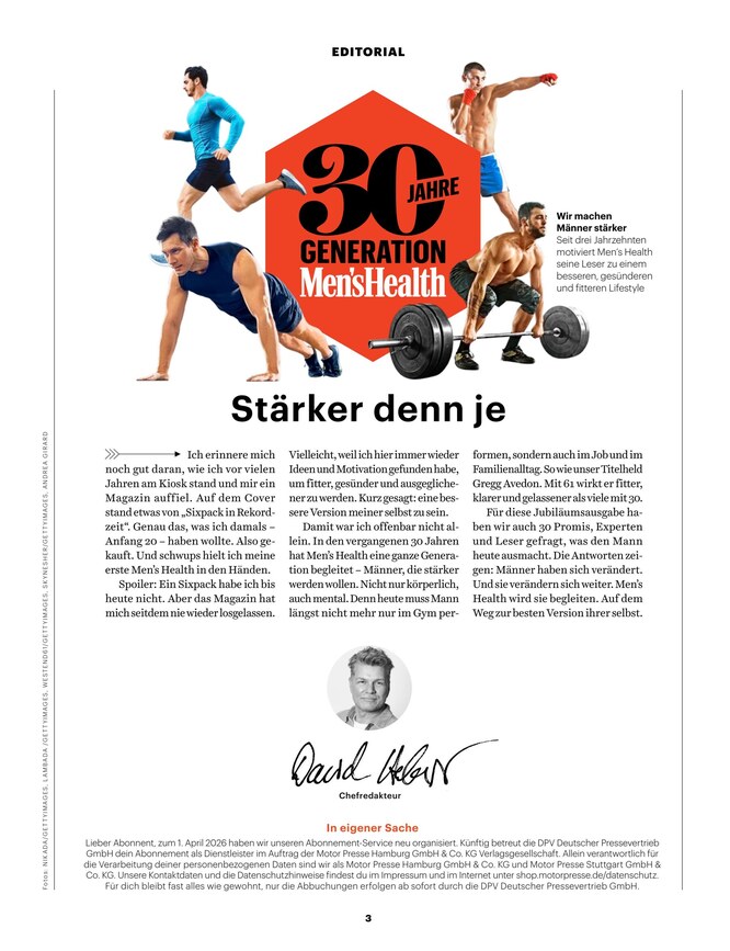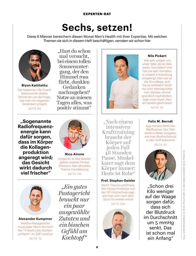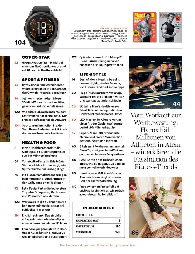 Fitness, Fashion und Lifestyle für aktive Männer sind die Themen, mit denen sich die monatlich erscheinende Zeitschrift Mens Health beschäftigt. Erfahren Sie im ePaper alles Wichtige rund um Training, Workout, Ernährung, Diät, Flirten und Technik. Das ePaper können Sie ganz unkompliziert am Computer, Laptop, Tablet oder Smartphone lesen. So bleiben Sie auch unterwegs über alle wichtigen News und Trends aus diesem Bereich informiert.