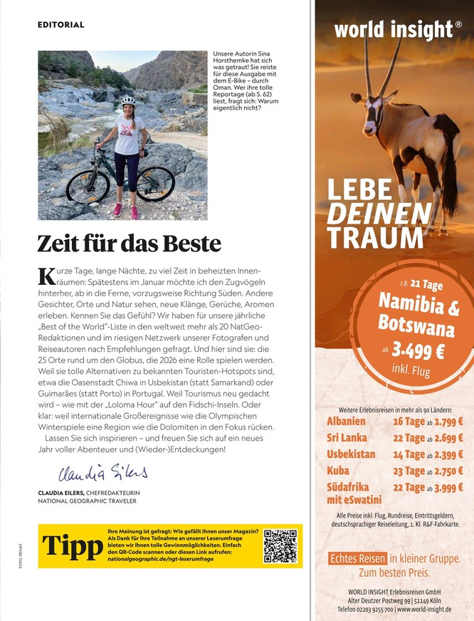 National Geographic Traveler bietet alles was das Reiseherz begehrt. Denn hier erhalten Sie nicht nur Tipps zu nachhaltige Themen wie Reisen ohne zu Fliegen oder Insider Tipps für den nächsten Städtetrip, sondern auch Inspirationen für ferne Länder und Inseln.