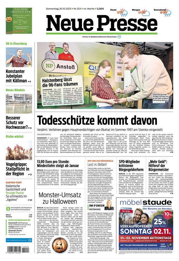 Sie möchten brandaktuelle News aus Hannover und der Region lesen? Dann greifen Sie einfach auf das ePaper hier im iKiosk zu oder laden Sie sich die aktuelle Ausgabe als PDF auf Ihr Endgerät herunter. Auch ältere Ausgaben der Neuen Presse können Sie bei uns finden, stöbern Sie dafür einfach in unserem Archiv.