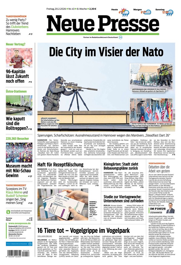 Sie möchten brandaktuelle News aus Hannover und der Region lesen? Dann greifen Sie einfach auf das ePaper hier im iKiosk zu oder laden Sie sich die aktuelle Ausgabe als PDF auf Ihr Endgerät herunter. Auch ältere Ausgaben der Neuen Presse können Sie bei uns finden, stöbern Sie dafür einfach in unserem Archiv.
