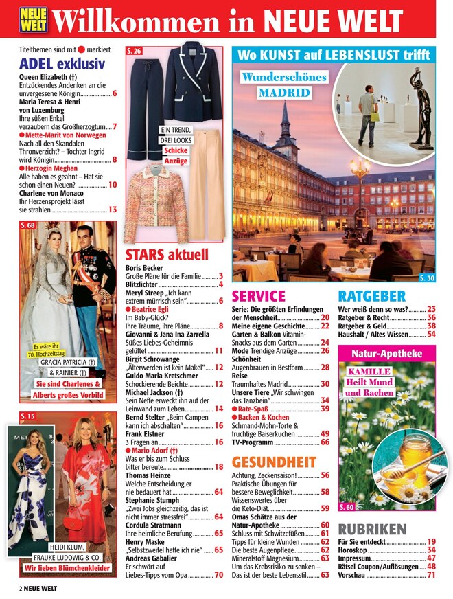 In jeder Ausgabe befindet sich das wöchentliche TV-Programm, sodass kein Höhepunkt verpasst wird. Die Ratgeber-Tipps sind umfangreich gestaltet und beraten zu Recht und Finanzen in allen Lebenslagen. Darüber hinaus gibt es neue Koch- und Backtipps. So wird Neue Welt Ihre treue Begleiterin für den Alltag.