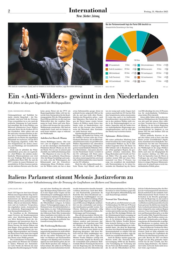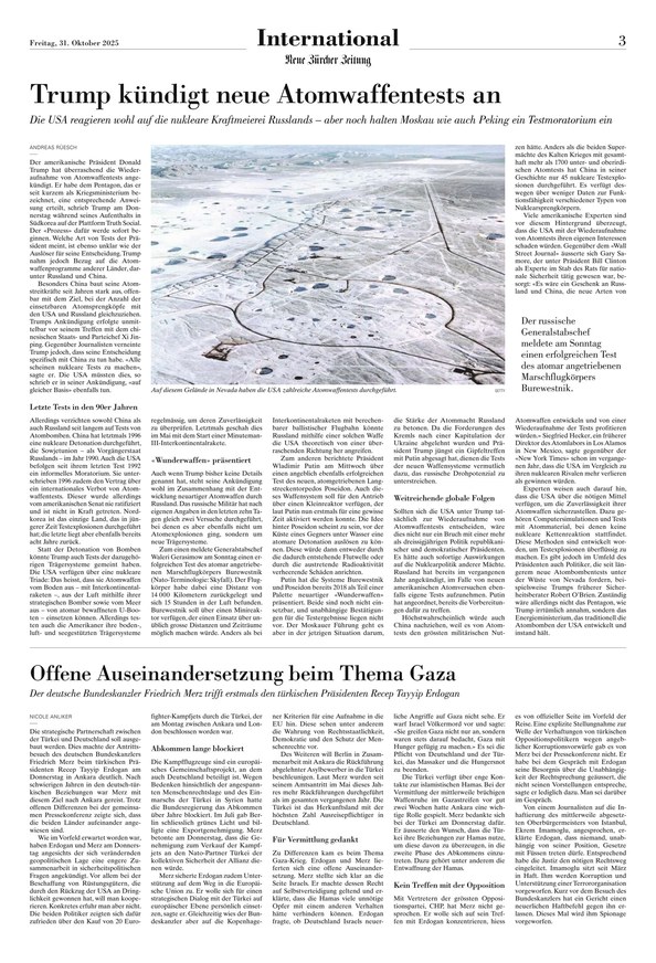 Die «Neue Zürcher Zeitung» bietet ein breites Themenspektrum von Politik, Wirtschaft und Gesellschaft über Kultur und Technologie bis hin zu Wissenschaft und Reisen. Redaktionen in Zürich und Berlin, unterstützt von einem weltweiten Korrespondentennetzwerk, informieren aus erster Hand über globale Entwicklungen und liefern neben Nachrichten fundierte Analysen zu allen wichtigen Themen unserer Zeit.
