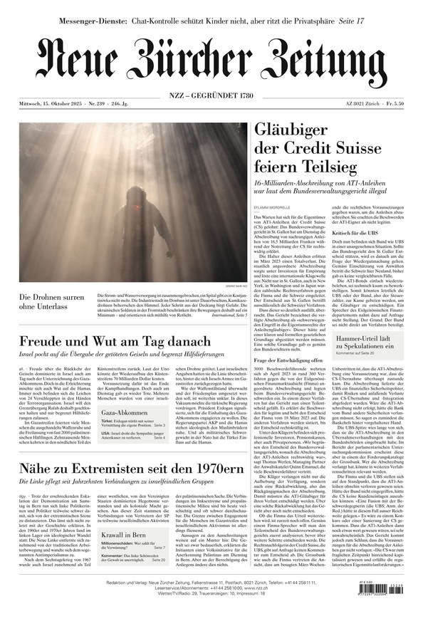 Entdecken Sie die «Neue Zürcher Zeitung»: mit Artikeln aus Politik, Wirtschaft, Wissenschaft und Kultur – immer mit dem Schweizer Blick auf globale Zusammenhänge. Die «Neue Zürcher Zeitung» erscheint montags bis samstags als Printausgabe und als E-Paper. Weiterlesen...