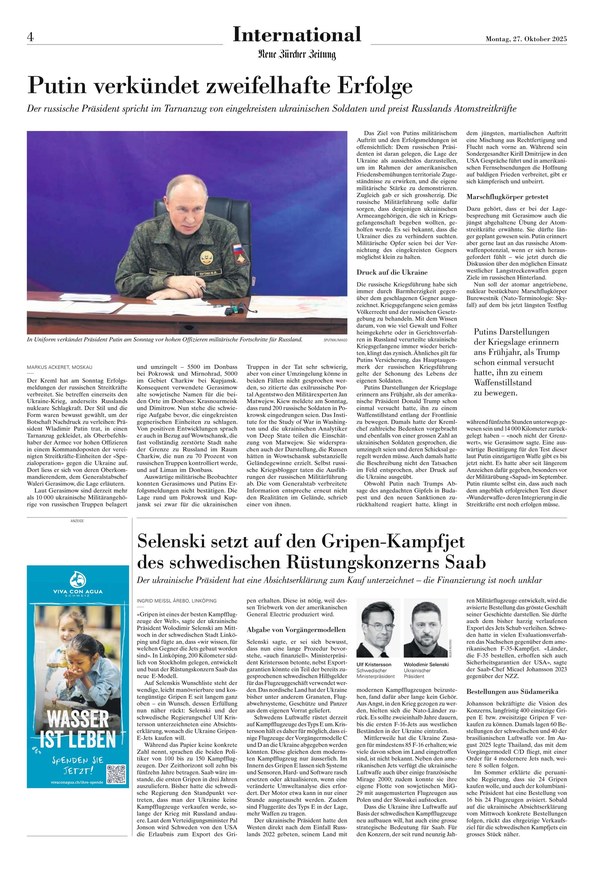 Entdecken Sie die «Neue Zürcher Zeitung»: mit Artikeln aus Politik, Wirtschaft, Wissenschaft und Kultur – immer mit dem Schweizer Blick auf globale Zusammenhänge. Die «Neue Zürcher Zeitung» erscheint montags bis samstags als Printausgabe und als E-Paper. Weiterlesen...