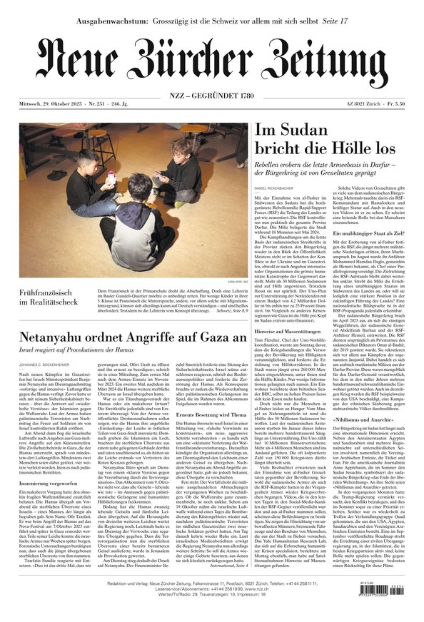 Entdecken Sie die «Neue Zürcher Zeitung»: mit Artikeln aus Politik, Wirtschaft, Wissenschaft und Kultur – immer mit dem Schweizer Blick auf globale Zusammenhänge. Die «Neue Zürcher Zeitung» erscheint montags bis samstags als Printausgabe und als E-Paper. Weiterlesen...