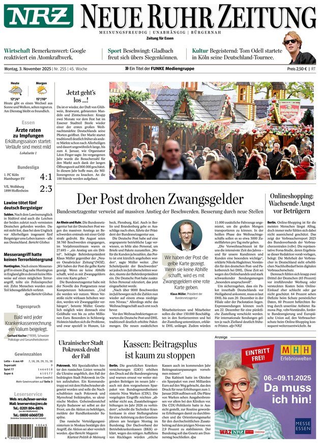 Ergänzt wird das inhaltliche Angebot durch das aktuelle Fernsehprogramm, Familienanzeigen und den Marktplatz mit Kleinanzeigen. Für Kinder gibt es eine eigene Seite, die mit dem Namen "Knuts Klartext" betitelt ist. Die erste Ausgabe der Tageszeitung, die zur Funke Mediengruppe gehört, erschien am 13. Juli 1946. Die gedruckte Ausgabe und das ePaper der NRZ sind inhaltlich und von ihrer Aufmachung her identisch - die digitale Tageszeitung liefert Ihnen die gewohnte Qualität der Print-Ausgabe.